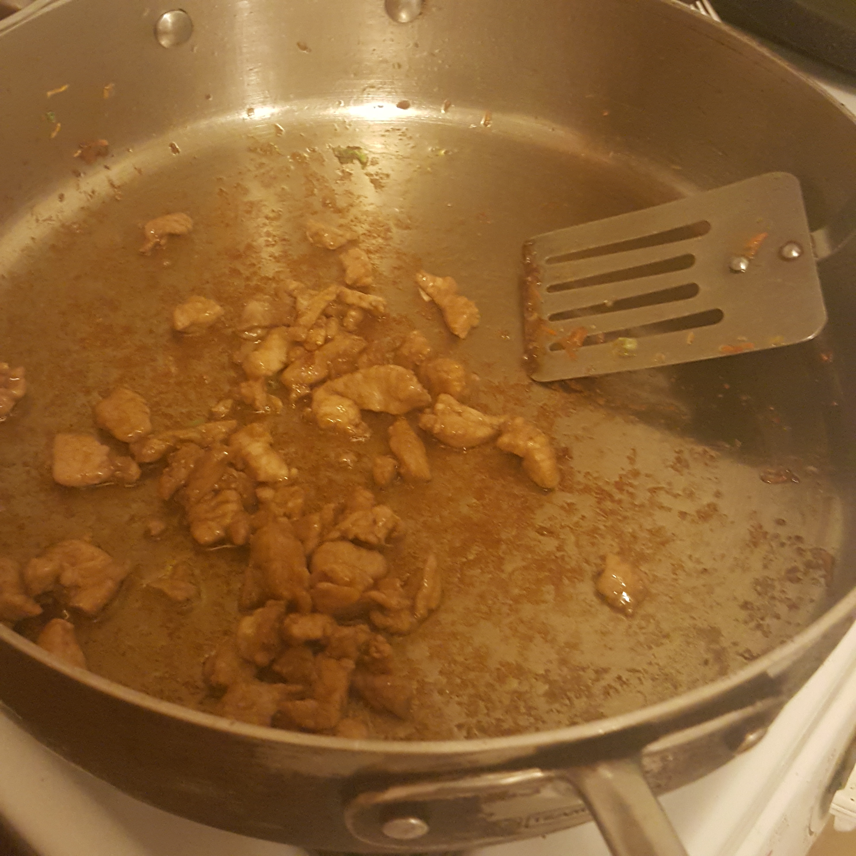 In place of a wok, I use a very large skillet on high to cook the meat in a little oil. When browned but not necessarily cooked through, remove from the pan and set aside.