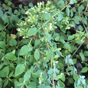 Culinary oregano (Oreganum vulgare) with happy bee pollinating the flowers in my Tucson garden (MABurgess)
