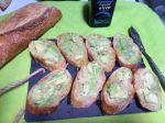 First step–to make the Four-layer “Salmon in the Tropics” Pintxo–spread avocado thinly on an oval of Barrio Bread baguette
