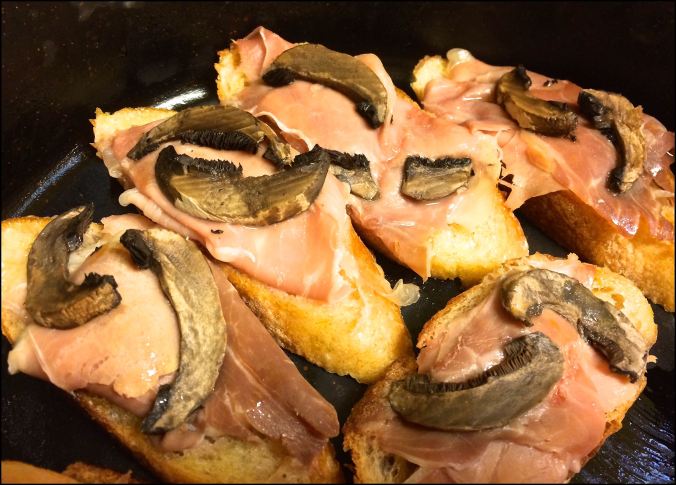 Best-yet pintxo: local thin-sliced ham on manchego cheese on Barrio baguette topped with farmers market mushrooms–and baked to perfection in solar oven (MABurgess photo)