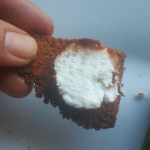 I then juiced a lime into the glass. But this wasn’t enough and I resorted to lemon juice I had frozen in quantity from the spring. Also, homemade mayonnaise (just an egg yolk with mild oil whisked into it until it is thick), store bought creama (Mexican sour cream). Basically, just keep adding and tasting until it is irresistible. Then a final sprinkling of fresh cheese (in this case, homemade goat cheese) sprinkled on top.