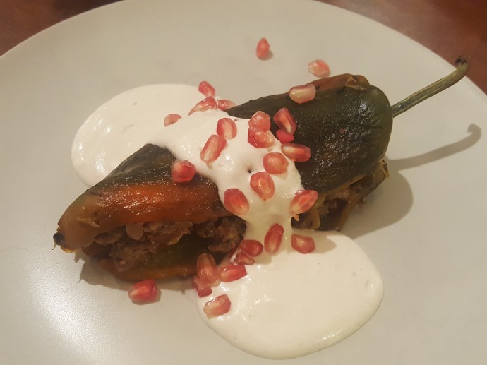 We also made chiles en nogada, filled with a complex pork and raisin filing, topped with walnut and almond sauce.
