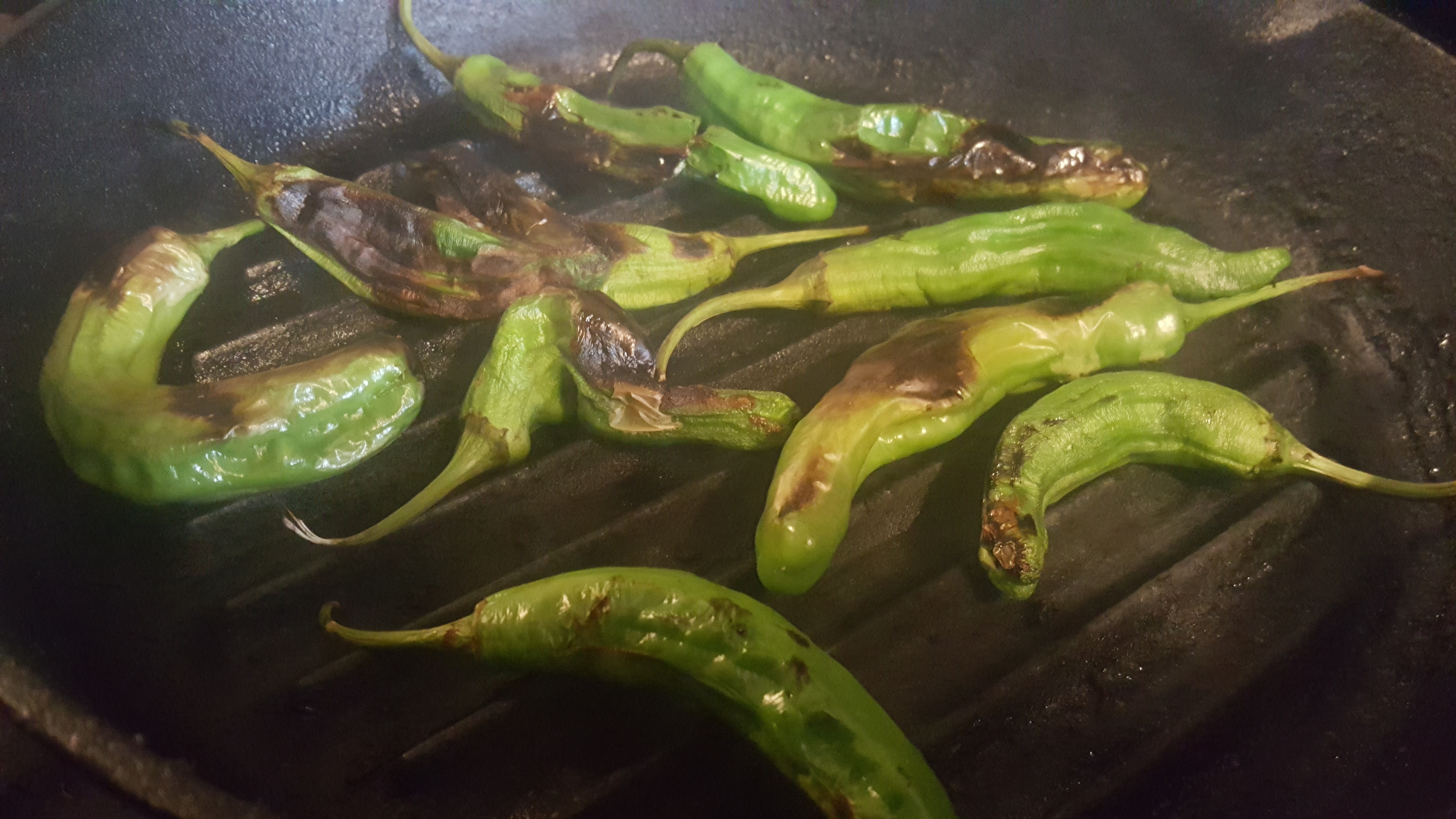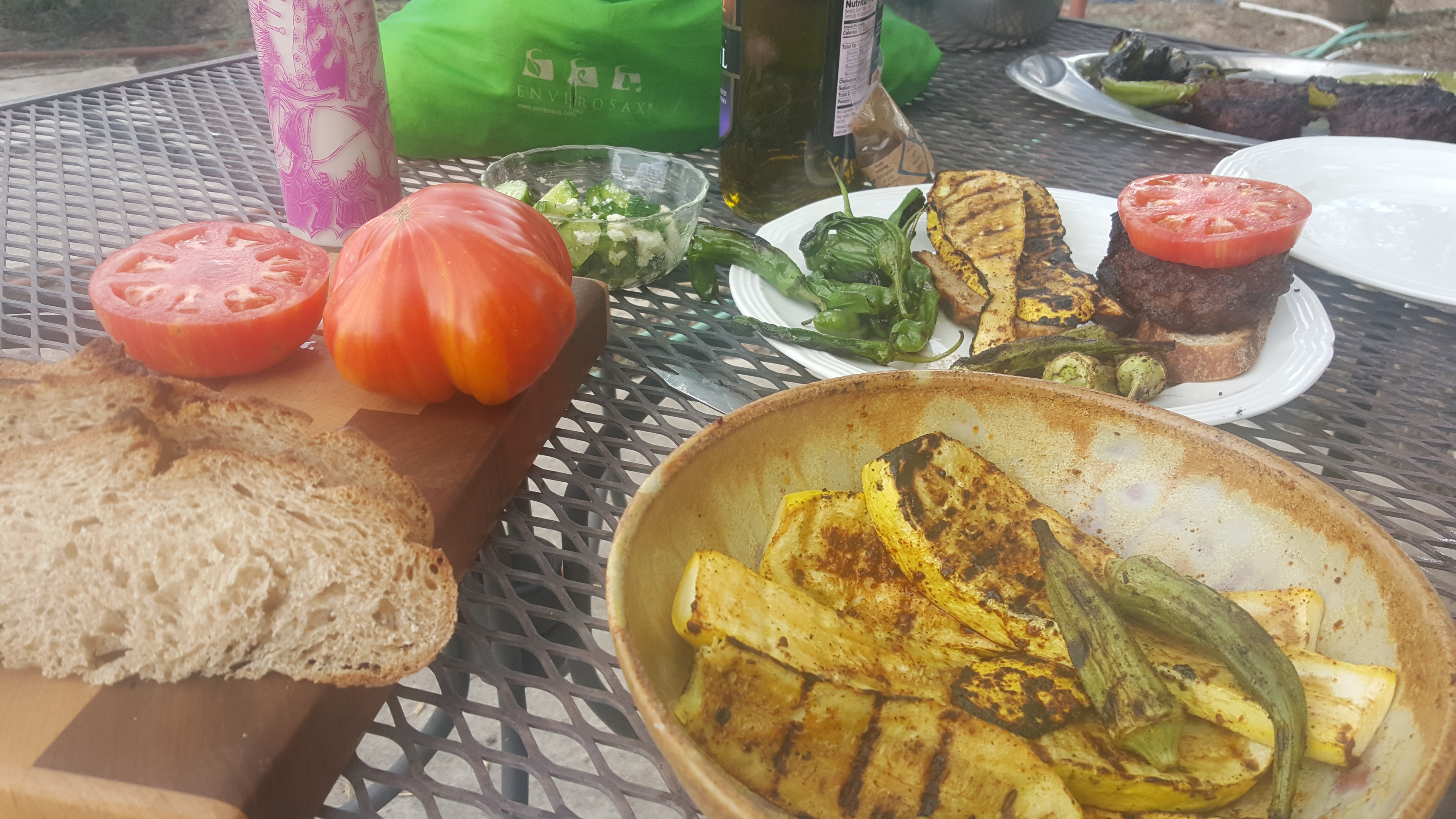 Amy here on a cloudy monsoon afternoon with a bounty of summer produce like long green chiles, Shishito peppers, okra, yellow squash and great tomatoes. It makes me want to grill and eat outside.