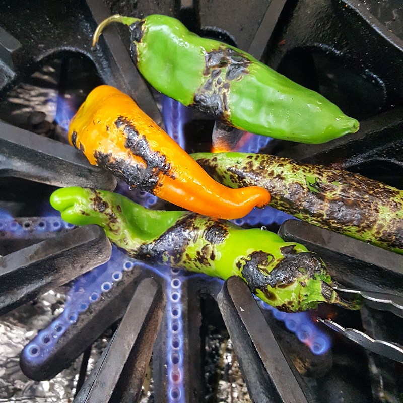 Hello friends, Amy here celebrating the harvest. At Tucson CSA this fall we had several batches of gorgeous, fleshy, green chiles! Farmer Frank of Crooked Sky Farm has been supplying us for years and years. The smell of charring them at home reminds me of doing it with my grandfather.