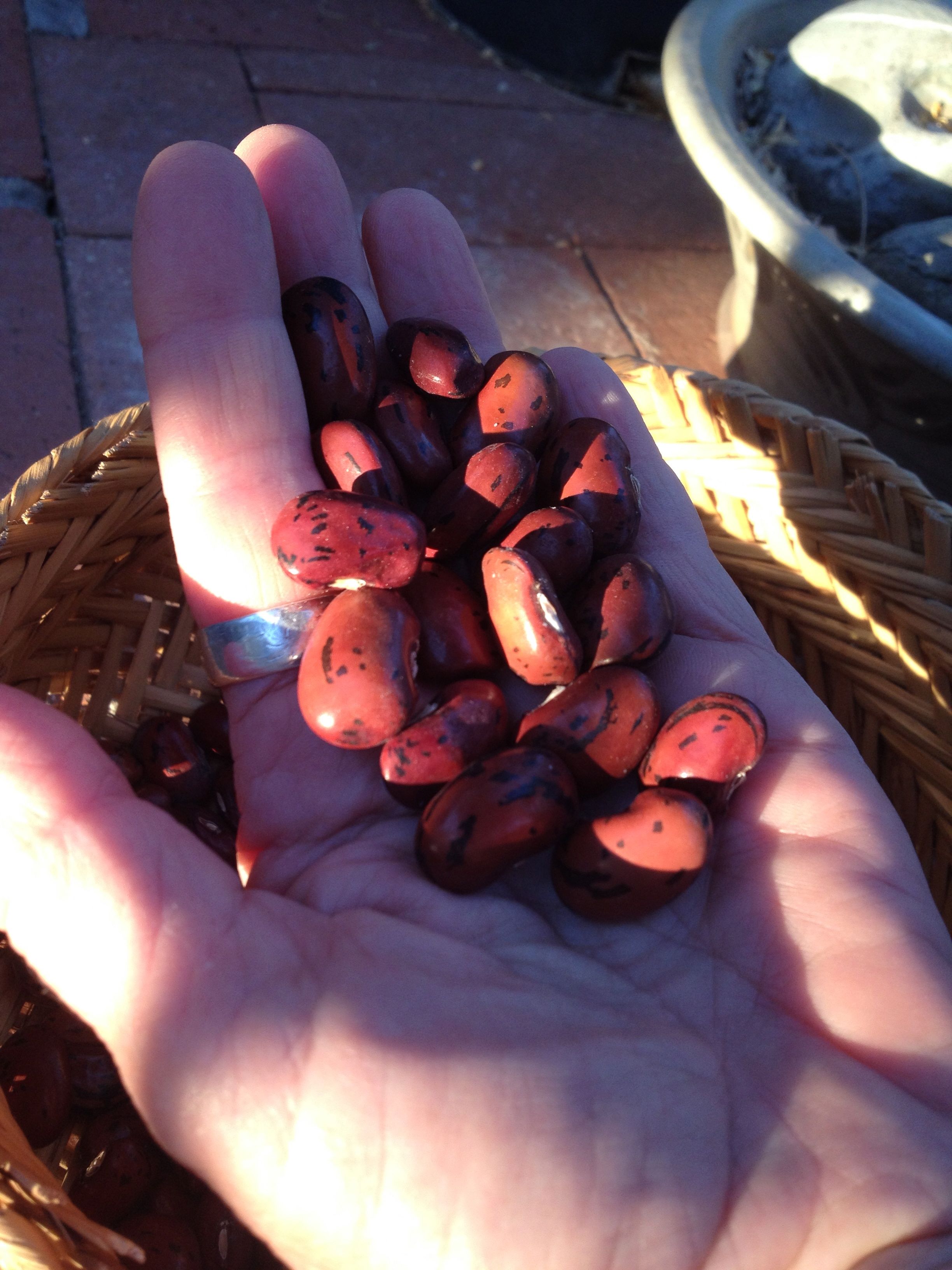 With the sap rising, and the gardening bug tugging at you, now is the perfect time to sew seeds of two very special long-season beans—the Tarahumara scarlet runner (see top of post) and the Aztec white runner (available at http://www.nativeseeds.org).   (Note: white runners looking like small Easter eggs are also referred to as “bordal” and, similar to the tomato by the same name, “mortgage lifter.”  If you can baby your young plants thru the heat and drought of May and June into monsoon growth, both of these beans will give you not only great food next fall but also glorious ornamental vines until then. Trellis them on the east side of your house or a wall for eastern light and protection from the blasting western sun. Hummingbirds will love you as they visit both the brilliant scarlet flowers and even the white flowers.