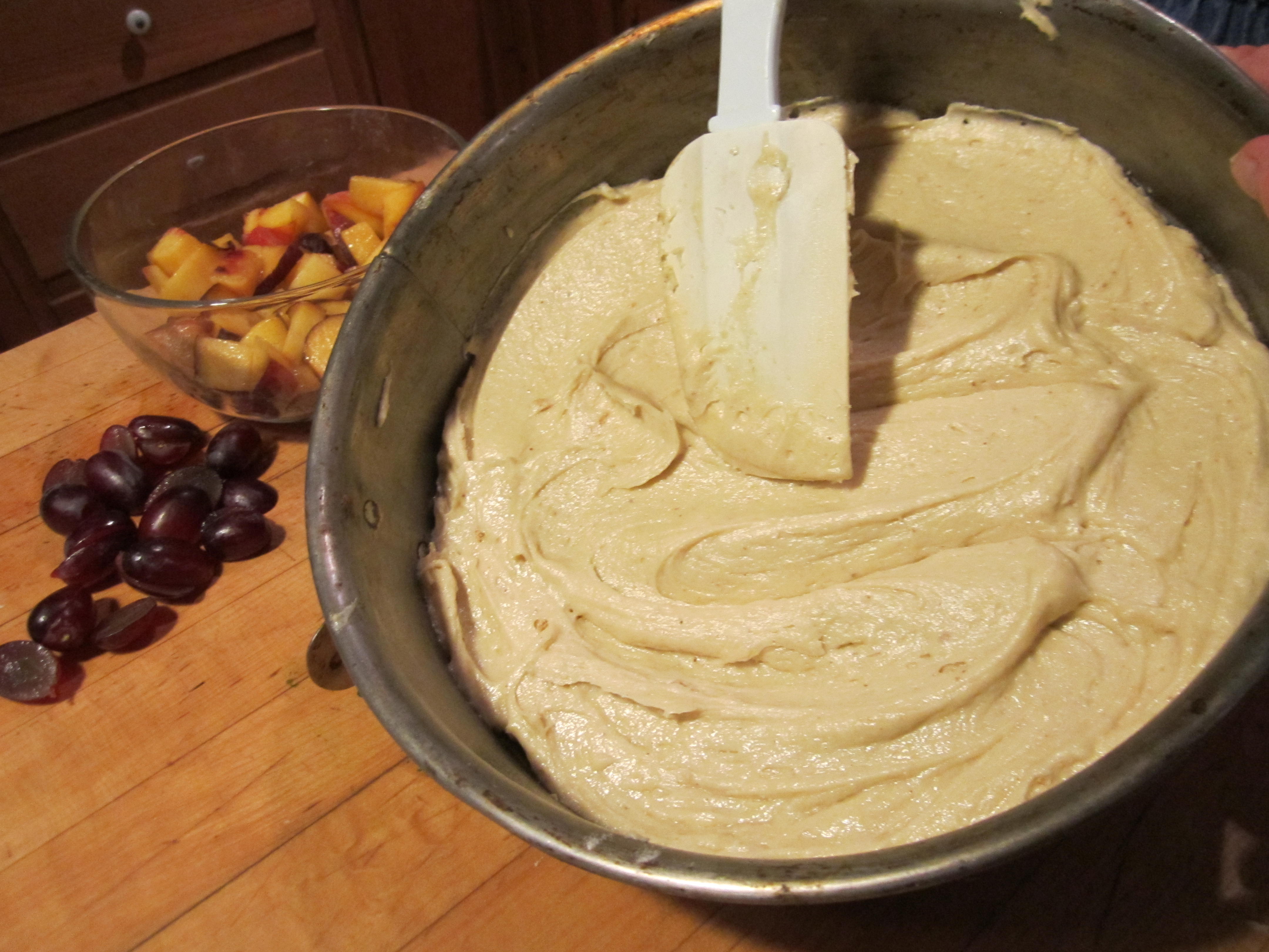 We are grateful to all of you readers who join us each week as we explore and celebrate the culinary delights of this fabulous area here on the Sonoran desert where we are so privileged to live. Every celebration needs something sweet, so today I’m going to give you a recipe for an easy and delicious mesquite cake that uses whatever fruits are in season. I used peaches and grapes, but plums, pears, apples or even prickly pear would be great additions. This is good for brunch or a not-too-sweet dessert.