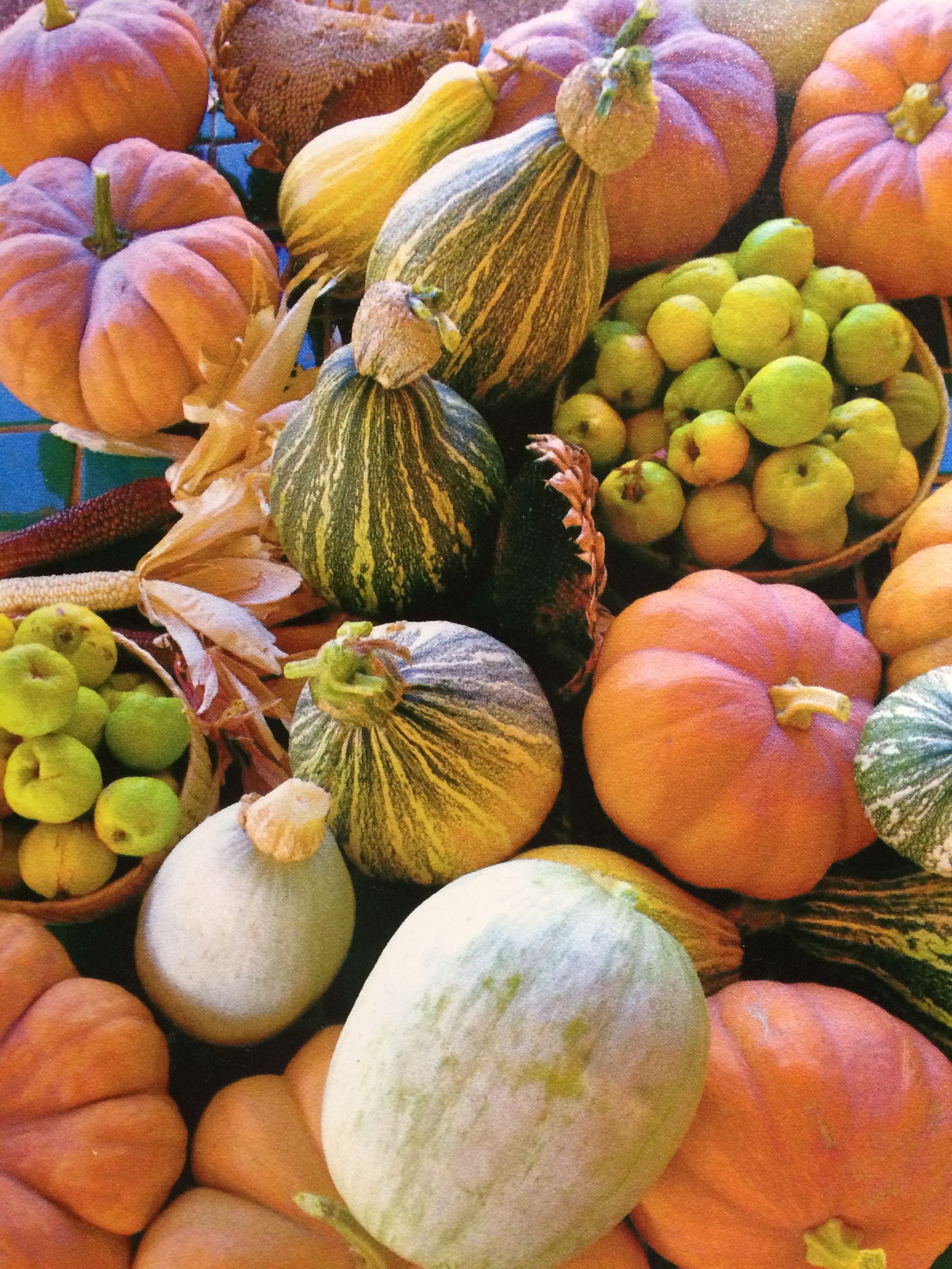 Living sculptures and a study in color–the fall harvest at Mission Garden, Tucson–Tohono O’odham Ha:l,   NSS Mayo Blusher, Magdalena Big Cheese pumpkin, membrillo fruit, T.O 60-day corn and chapalote corn (MissionGarden photo)