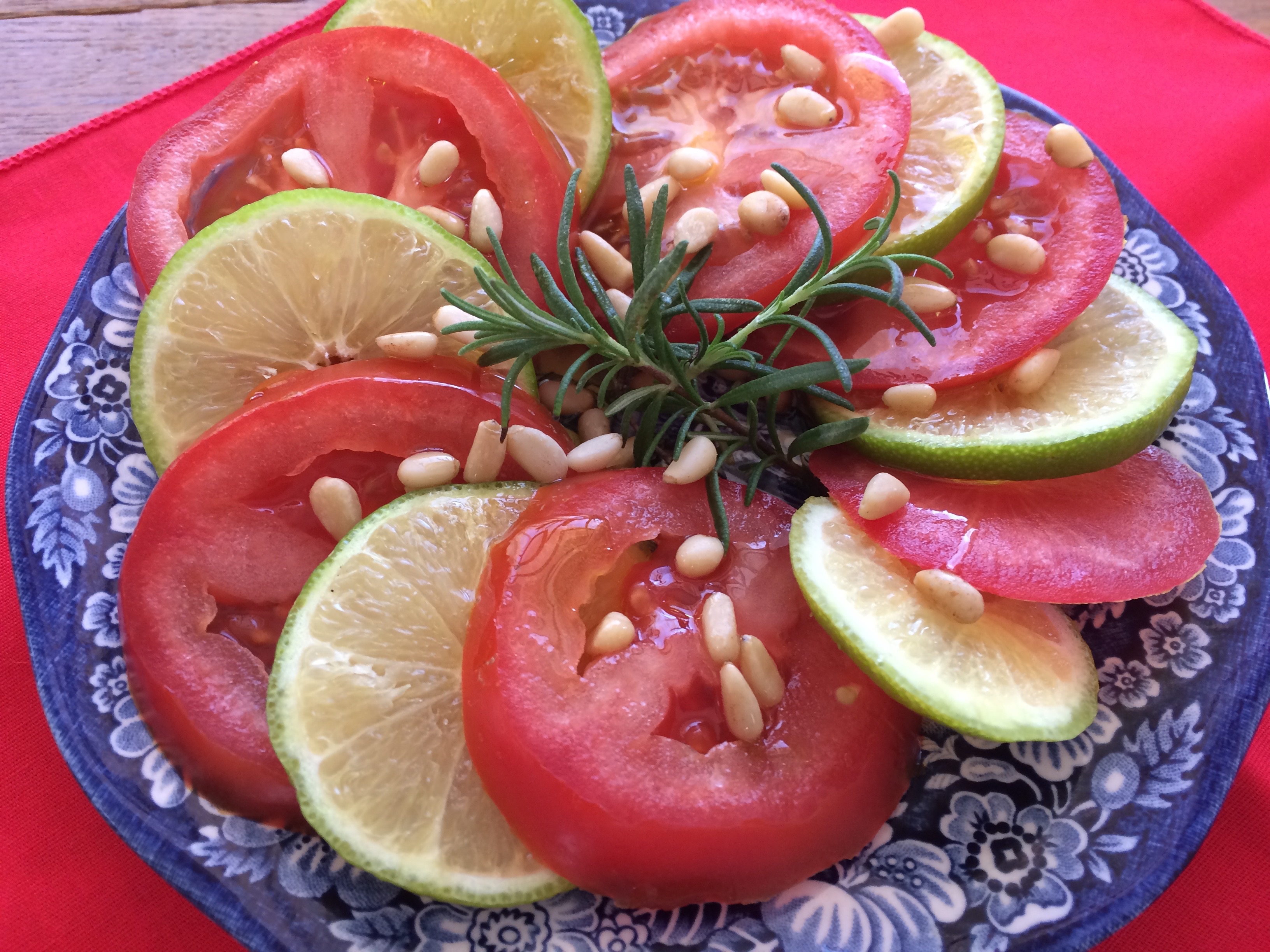 Sweet-lime, sweet sliced tomato, and rosemary Garni, topped with pine nuts and drizzled with olive oil.