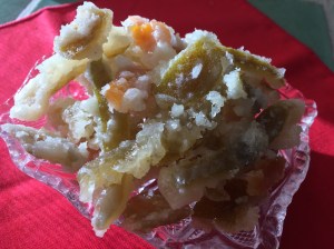 Add 2 T pine nuts (optional—they won’t show) and 1 T chopped tops of I’itoi’s Onion (or chives)