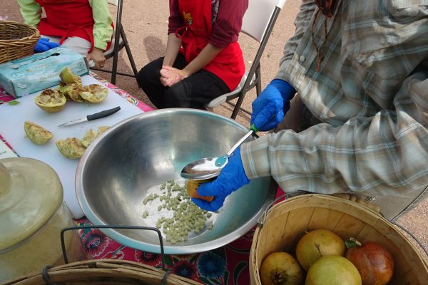 I wrote about pomegranates at this time last year, but I’ve learned some new tricks to prepare them so it’s worth another post, especially since so many people find themselve intimidated by these gorgeous red fruits with the hard outer shell. It’s Carolyn today, and I learned these tricks at a teaching and tasting experience at Mission Garden in Tucson given by Emily Rockey, the plant whisperer responsible for the health of all the plants at the garden. Mission Garden is a living agricultural museum of Sonoran Desert-adapted heritage fruit trees, traditional local heirloom crops and edible native plants in the same location as the original garden of the San Augustin Mission in 1770s. Before that this land was farmed for a thousand years by Native American agriculturalists. Among its many varieties of fruit trees, Mission Garden grows eleven different cultivars of pomegranates, all sourced through cuttings from spots around Southern Arizona and Northern Sonora Mexico.