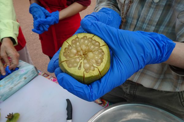 I wrote about pomegranates at this time last year, but I’ve learned some new tricks to prepare them so it’s worth another post, especially since so many people find themselve intimidated by these gorgeous red fruits with the hard outer shell. It’s Carolyn today, and I learned these tricks at a teaching and tasting experience at Mission Garden in Tucson given by Emily Rockey, the plant whisperer responsible for the health of all the plants at the garden. Mission Garden is a living agricultural museum of Sonoran Desert-adapted heritage fruit trees, traditional local heirloom crops and edible native plants in the same location as the original garden of the San Augustin Mission in 1770s. Before that this land was farmed for a thousand years by Native American agriculturalists. Among its many varieties of fruit trees, Mission Garden grows eleven different cultivars of pomegranates, all sourced through cuttings from spots around Southern Arizona and Northern Sonora Mexico.