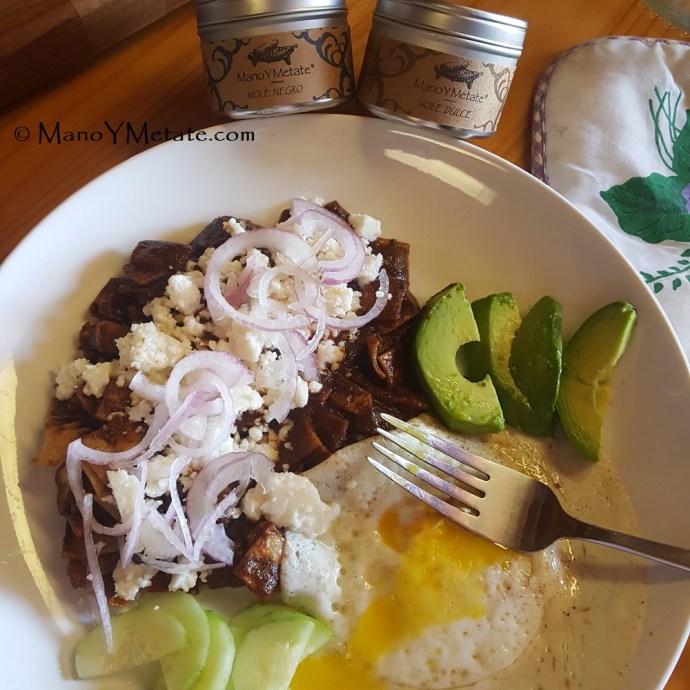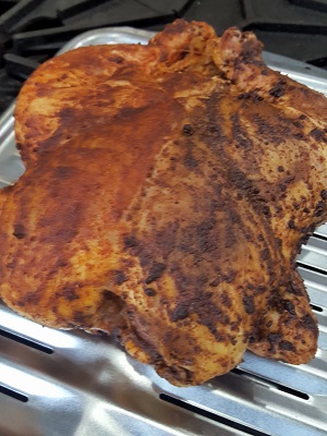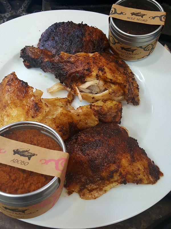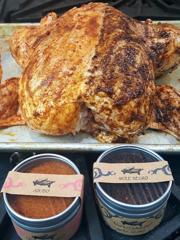 I wanted to make a roast chicken with mole as a seasoning, rather than as a sauce. Something exciting but still traditional enough for a roast chicken or turkey. Also, I couldn’t decide which variety of mole to use. So I separately mixed some Mano Y Metate Adobo and Mole Negro powders with olive oil and rubbed them one on each side of a chicken. I slid some under the skin and in the cavity. I sprinkled a little salt everywhere, too.
