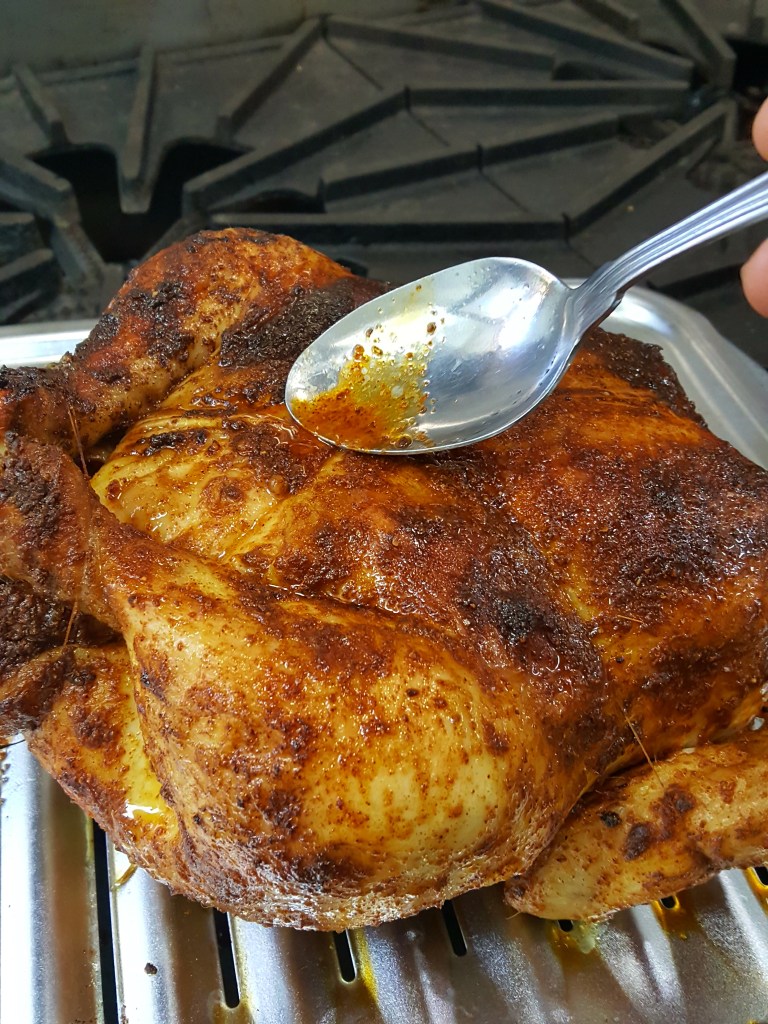 The bones and drippings made an incredibly rich colored broth with hints of mole. It was spicier than I thought it would be. I can’t wait to make it into soups, the best part of roasting a bird. Enjoy the weather and happy cooking!