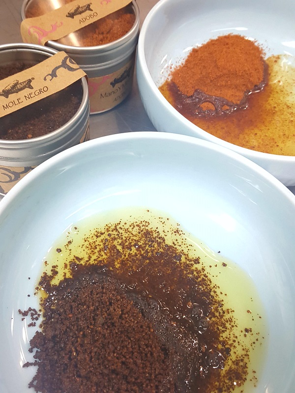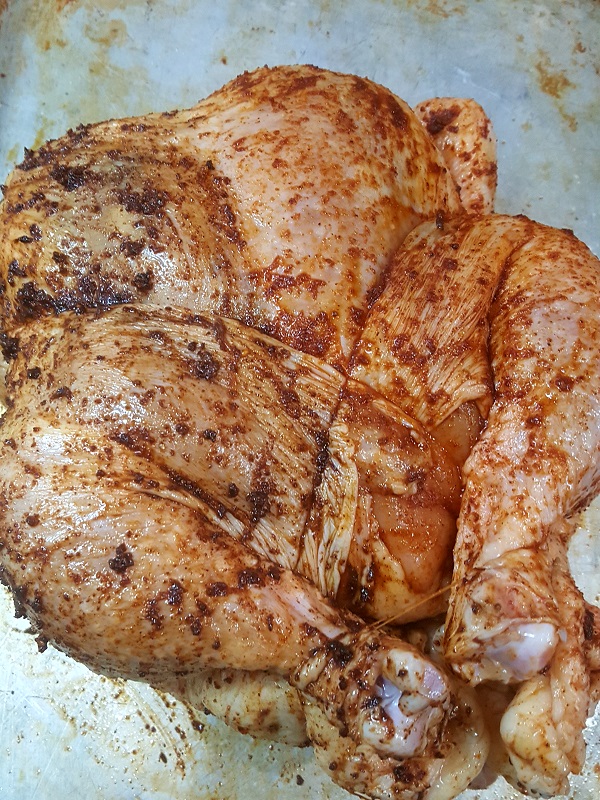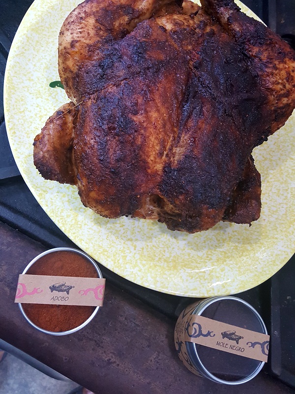 I wanted to make a roast chicken with mole as a seasoning, rather than as a sauce. Something exciting but still traditional enough for a roast chicken or turkey. Also, I couldn’t decide which variety of mole to use. So I separately mixed some Mano Y Metate Adobo and Mole Negro powders with olive oil and rubbed them one on each side of a chicken. I slid some under the skin and in the cavity. I sprinkled a little salt everywhere, too.