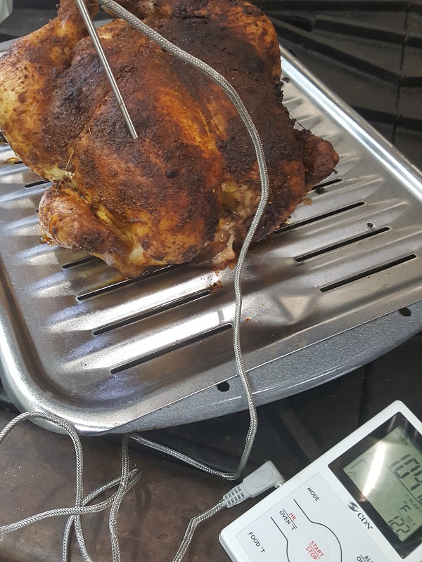 After it was almost to temperature (160 degrees F) I cranked the oven to 400 to crisp the skin for the last few minutes. Then I removed it from the oven, and while resting ensured the breast temperature climbed over 165F.