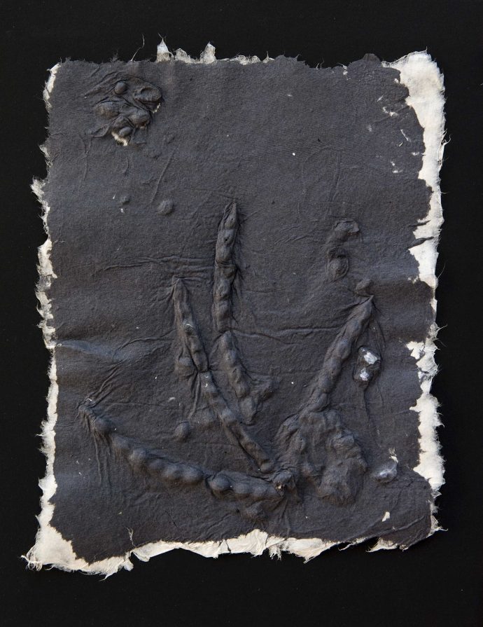 Image to left: Hiding under that green cloak of giant spotted leaves of this year’s Tohono O’odham HA:L (growing in the Hohokam-period Timeline Garden at Mission Garden) you might find male flowers, then later, female flowers