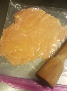 If dough has been shaped into patties then gently roll to desired thickness, cut desired shapes. If dough was rolled into logs then gently cut to desired thickness with a sharp knife to avoid crushing the logs.
