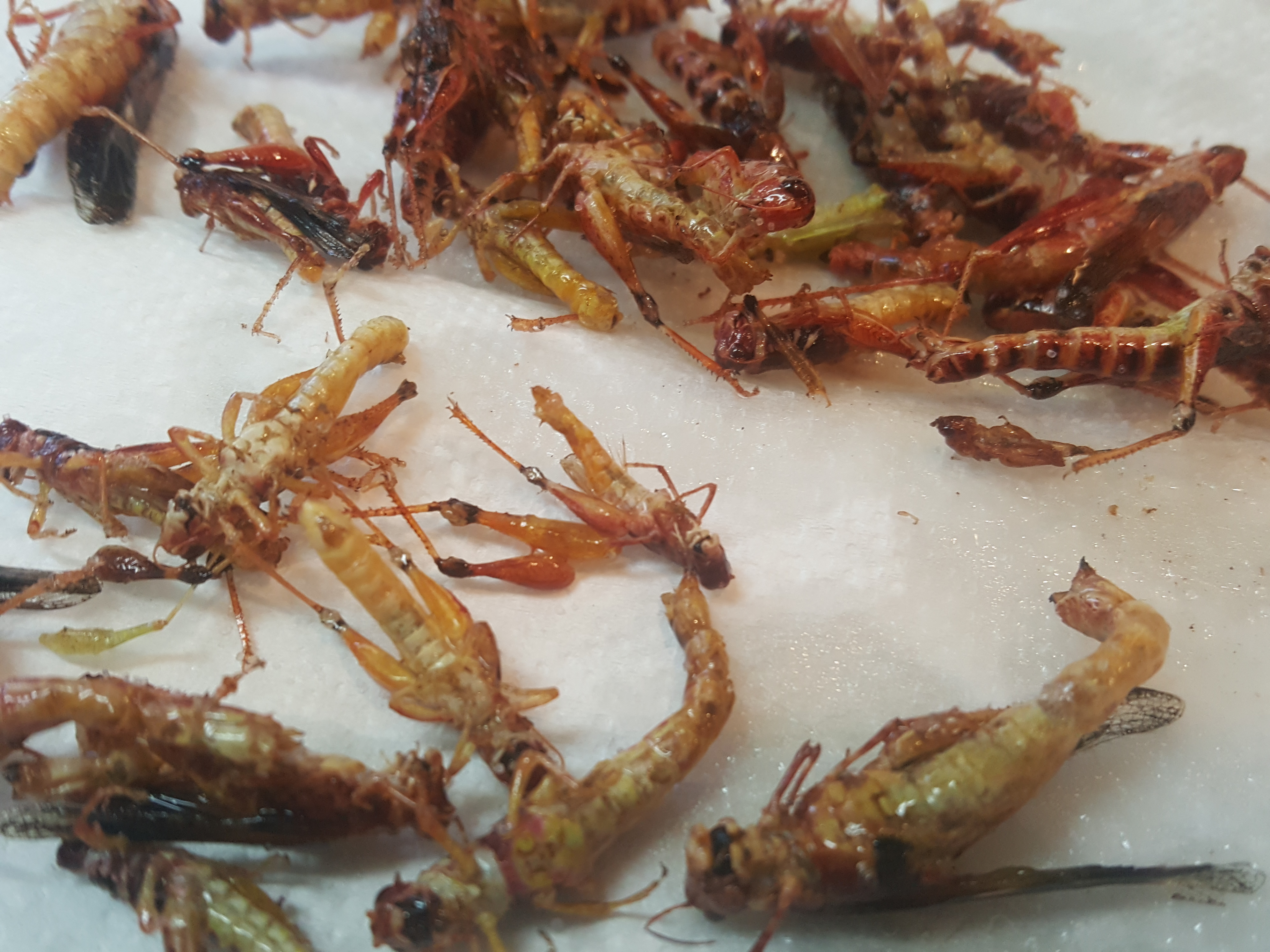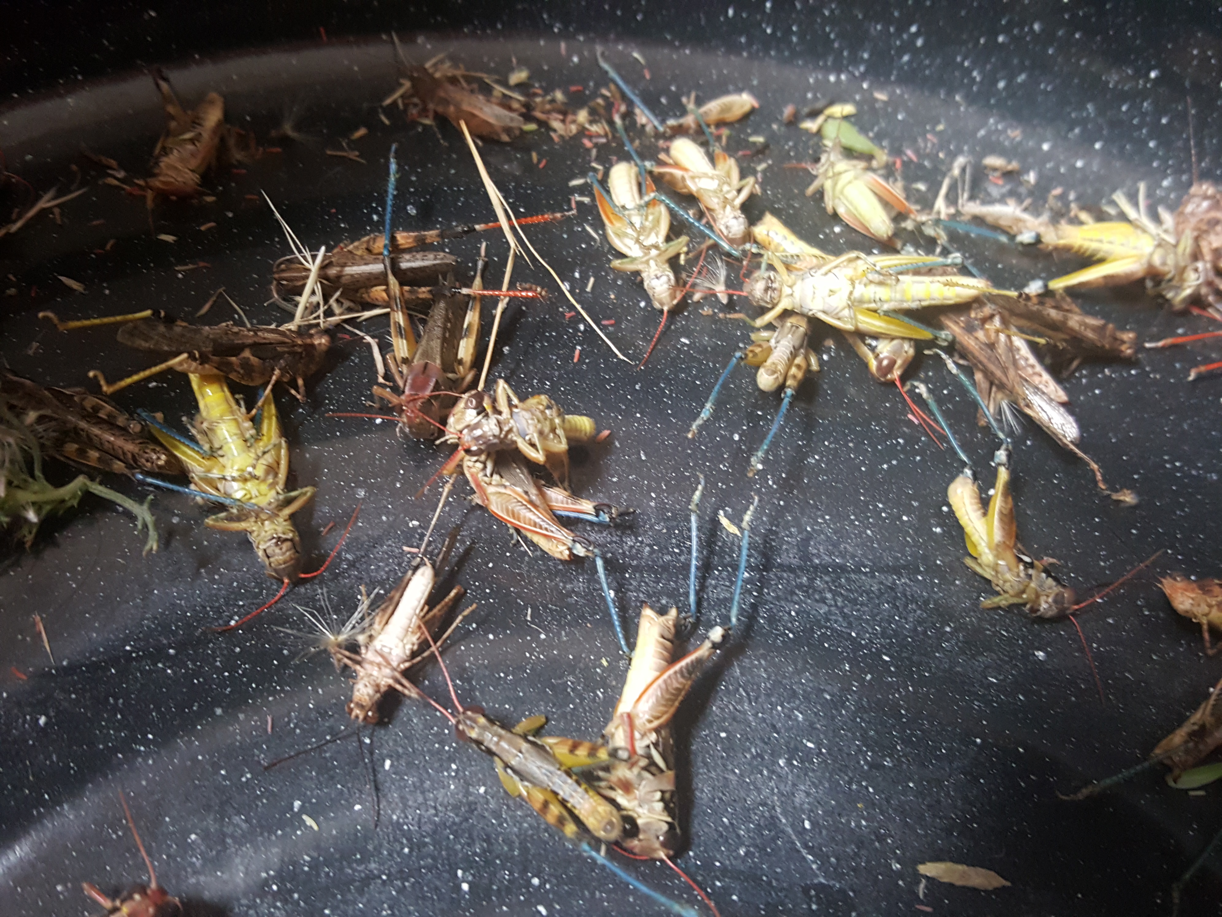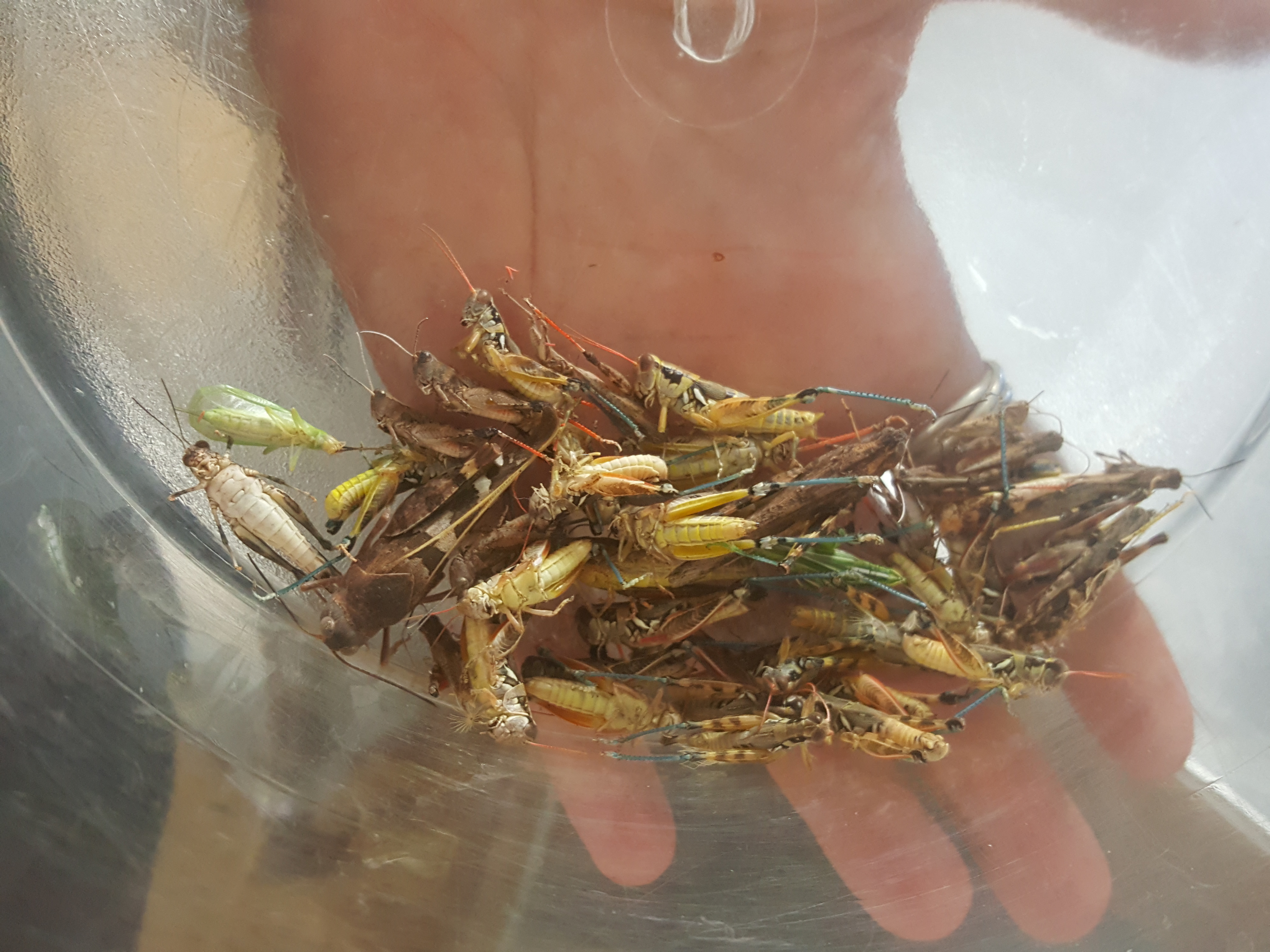 Catching them is the trick! When the sun is up, they are fast. We managed to flush some out of the grass into a clearing, toss a big straw hat over one, and grab it by hand. We bagged three, not even enough for one taco. As the sun set, they stopped jumping but were too hard to see in the grass in the low light. We returned with nets. In the cool early morning they weren’t active enough to jump into the nets but were easier to see; we tossed the net over one, and grabbed it by hand. As the day warmed, they got too fast for that method, and sweeping the grass with the net was more successful. Yes, it’s slow, but fun. Plus a beautiful day in the desert.