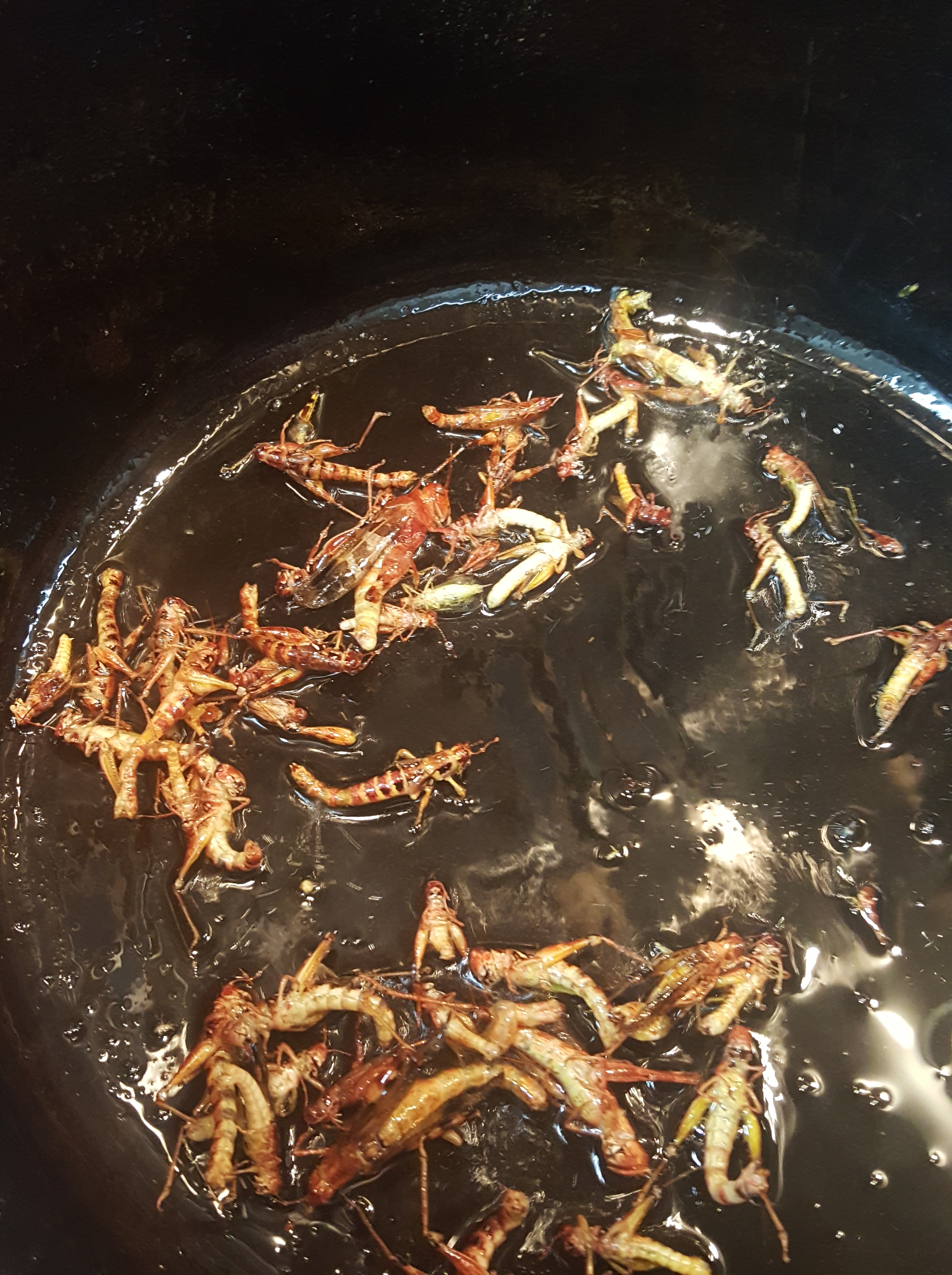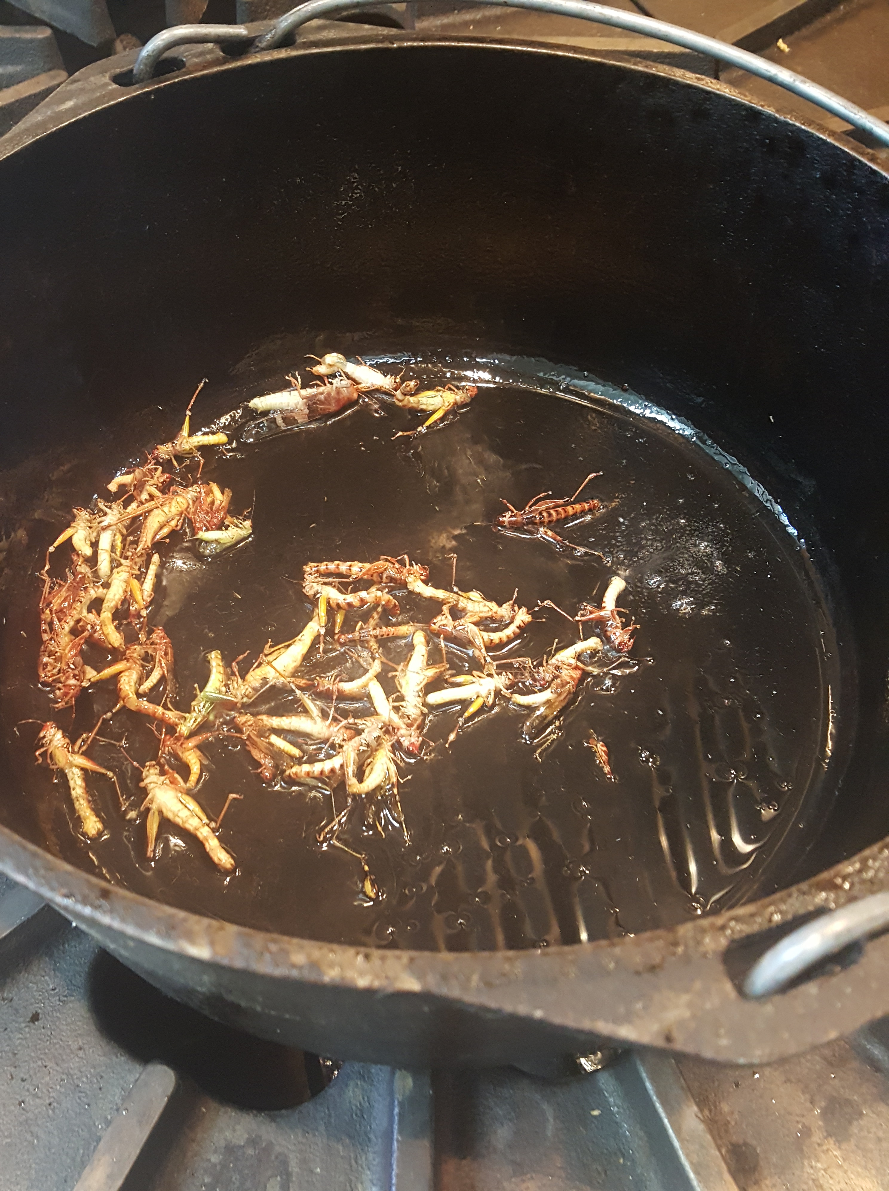 We melted a little duck fat a cast iron pan and fried the chapulines.