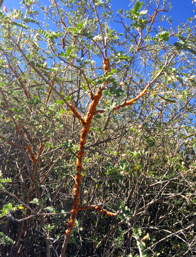 An interesting story emerged. He said how traditional people of Sonora used to harvest it as actual food–a healthful nutrient! This gum-substance is exuded by a piercing-sucking insect (Tachardiella fulgens in the Order Hemiptera) as a protective shield from predators and the elements as it draws nutrients from its host plant. I learned from ethnobotanists Drs.Robert Bye and Adelmire Linares of Universidad Autonoma de Mexico that Native people including the Raramuri (Tarahumara) of the Sierra Madre used it not only as food but also as a remedy for poisoning. It is even reported as a dye material. Traditionally, the Tohono O’odham also used this translucent, orange-brown gum as an adhesive mixed with adobe to tightly seal their jars of bahidaj sitol (saguaro fruit syrup). Talk about multi-use!