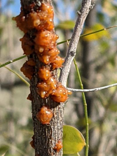Colorful crusty exudate of the Lac Scale insect that specializes on Coursetia glandulosa (MABurgess photo)